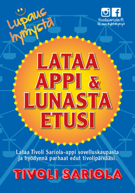 Asiakkaiden pitkäaikaisiin toiveisiin on vastattu ja Tivoli Sariolalla on nyt oma appi! Sovelluksen kautta saat pääsyn kätevästi useisiin etuihin ja alennuksiin sekä ajantasaista tietoa tivolikentän tapahtumista. Edut vaihtelevat paikkakunnittain ja ovat lunastettavissa kerran kyseisen paikkakunnan vierailun aikana. Etuja on tarjolla lipputuotteisiin, pelipisteille sekä tivolin muille myyntipisteille. Löydät appin Google Playn kautta TÄÄLTÄ ja App Storesta TÄÄLTÄ.